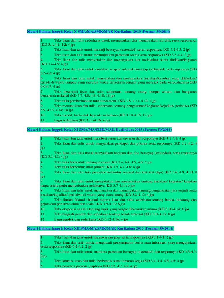 Materi bahasa inggris untuk kelas 10 sma bahasa inggris untuk kelas 10 akan dipelajari materi yang berkaitan seperti reading texts, expressens, dan grammar. Salah satunya lewat materi ini, analytical exposition text. Sma memiliki tiga kelas yaitu kelas 10, kelas 11 dan kelas 12 dan disemua tingkatan tersebut mempelajari bahasa inggris. Rangkuman materi bahasa inggris kelas xi semester 1. Di kelas 11 ini kita akan mempelajari tentang berbagai expression, reading texts, dan grammar tentunya. Pelajari materi latihan soal dan pembahasan bahasa inggris sma kelas 11 kurikulum 2013 revisi. Kunci jawaban soal bahasa inggris smk kelas xii semester 1. Untuk mendapatkan soal dan kunci jawaban pat bahasa inggris kelas 11 tahun 20202013 di bawah ini adalah link download. Pada kesempatan kali ini kami ingin memberikan rangkuman materi pelajaran bahasa inggris untuk sma kelas 11 semester 1 dan 2. Silabus bahasa inggris berkarakter sma kelas xi semester 1 2. Choose one of the topic given below. Tidak shanya oleh para siswa tingkat elementary dan intermediate saja, tingkat advance pun harusnya sudah bisa menguasai materi percakapan ini. Teks jenis ini berkaitan dengan materi awal tentang asking & giving opinions dan factual report text yang dibahas sebelumnya.